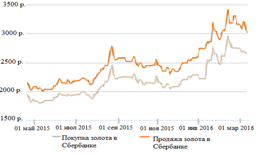 Памятные и инвестиционные монеты можно использовать в качестве хорошей альтернативы долларовым вложениям. В России стоимость драгоценных металлов регулярно растёт, в том числе золото и серебро. Для подтверждения можем посмотреть на график колебаний котировок на золото в Сбербанке России на 2015- начало 2016 гг. (рисунок 10).