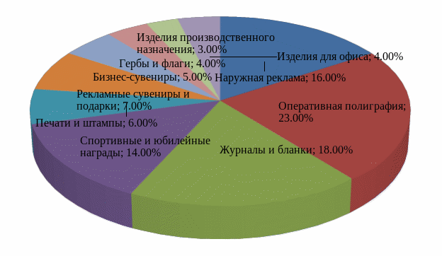 Лидирующей услугой является изготовление бланков. Это объясняется наличием постоянных клиентов в соответствующей сфере (больницы, поликлиники). В 2013 году спрос на спортивные и юбилейные награды был также связан с сотрудничеством со спортивными организациями.