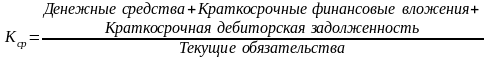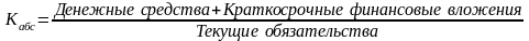 Коэффициент абсолютной ликвидности представляет собой отношение денежных средств и текущих обязательств предприятия, и рассчитывается по бухгалтерскому балансу: