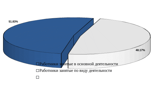 Наибольший удельный вес в структуре кадров по видам деятельности дирекции занимают работники, занятые в основной деятельности (50,06 % в 2014 году, 51,96 % - по плану 2015 года и 51,83 % - по факту 2015 года).