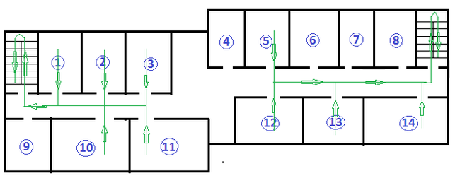 Так как на третьем этаже здания находятся два выхода, разделим эвакуируемые помещения на две зоны: 1 зона (помещения № 1,2,3,10,11) эвакуируются через левый выход, 2 зона (помещения №5,12,13,14) - через правый выход. Эвакуация из бытовых и технических помещений не производится.