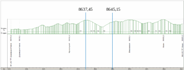 Продольный профиль пути с существующими уклонами на участке Дормидонтовка-Аван представлен на рисунке 4.4. Также, указаны ординаты точек минимального напряжения на токоприёмнике электроподвижного состава(8637,45 км для первого и 8645,15 для второго пути, соответственно).