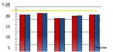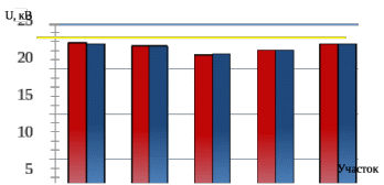 При анализе результатов расчёта, полученных в КОРТЭС (таблица 4.1 и рисунки 4.4 и 4.5), видно, что Волочаевка – Хабаровск-2 и Дорминдонтовка – Аван являются лимитирующими участками, так как минимальные значения напряжения на токоприёмнике на этих участках близки к критическим. Согласно ПУСТЭ-97 [21] минимально допустимое напряжение на токоприёмнике ЭПС U3мин = 21 кВ (среднее значение за три минуты) и минимально допустимое снижение напряжения (среднее значение за одну минуту) Umin= 19 кВ.