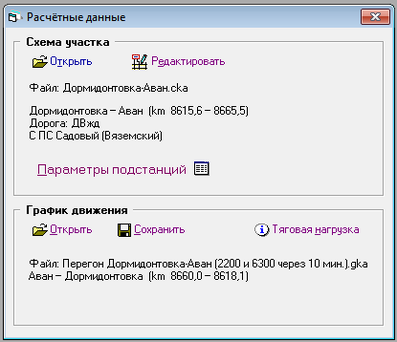 Данные взяты из программного комплекса КОРТЭС, - программа Uchastk. Программа Uchastk предназначена для ввода и редактирования параметров расчетных участков, таких как: названия и координаты расположения раздельных пунктов, число главных путей, спрямленный продольный профиль пути с учётом фиктивных уклонов от кривых, ограничения скорости для каждой категории поезда, категории и типы обращающихся на участке поездов и прочее. [22]