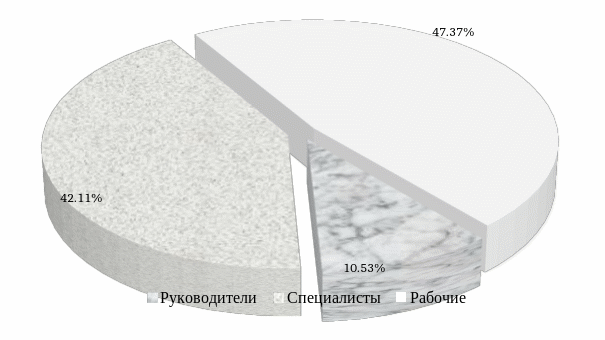 Как видно из таблицы 2.8 и рисунка 2.3 следует, что основную долю в структуре кадрового состава предприятия занимают рабочие – 47,37 % в 2016 году (42,5 % в 2014 году, 51,35 % в 2015 году).