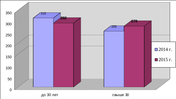 Рисунок 6 показывает, что количество лиц, имеющих возраст до 30 лет в 2015 г. составил 38,5% от общего числа работающих, тогда как в 2014 г. указанный процент составил 38,1%. Количество работников в возрасте 30 лет и старше существенно не изменилось в меньшую сторону в 2015 г. – 25,8% от общего числа работников, в 2014 г. – 24,1%.