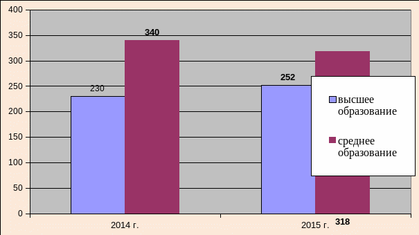 Из рисунка 5 следует, что по сравнению с 2014 годом, на 3,6 % увеличилось количество сотрудников, имеющих высшее профессиональное образование, на 19,2%, имеющих среднее профессиональное образование.