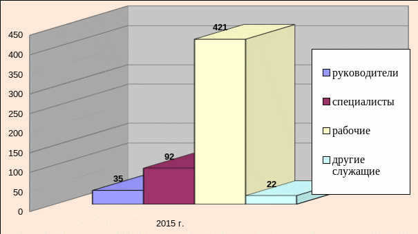Из данных таблицы 4 следует, что в результате реализации плана мероприятий оптимизации численности персонала, списочная численность состава в 2015 г. составила 575 человек, что на 4,5% выше, чем в 2014 г. Из них руководителей: 35 человек, что составляет 9,4% от общей численности, специалистов: 92 человека, что составляет 29,7%, рабочих: 421 человек – 59.8%, других служащих 22 человек – 1,2% от общей численности.