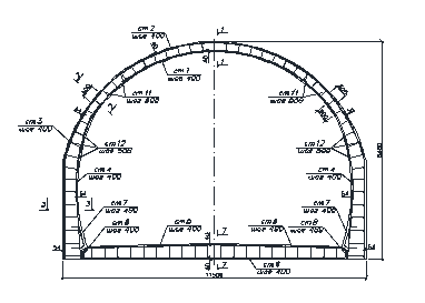 Для тоннельной обделки типов 1 и 2 при крепости породы f=3,0 и 9,0 в замковом сечении и в сечении с максимальным отрицательным моментом принимается9 стержней рабочей арматуры диаметром 14 (мм) класса A300. В стене принимается9 стержней рабочей арматуры диаметром 14 (мм) класса A300.
