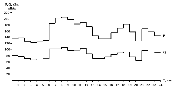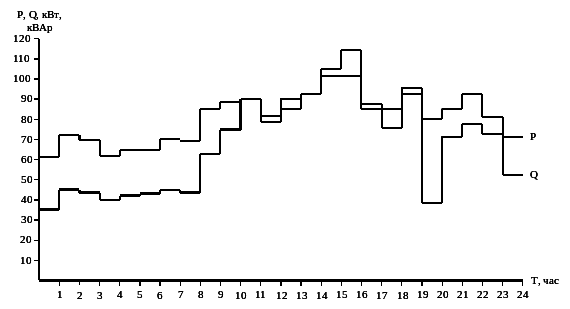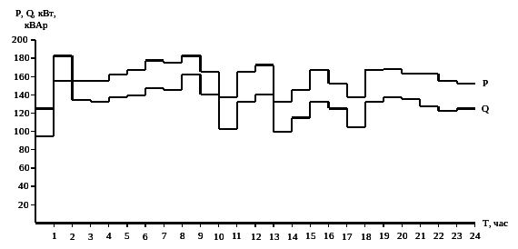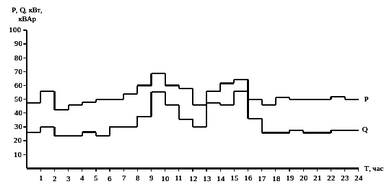 | Наименование нагрузки | Наибольшая активная мощность Pmax, кВт | Наибольшая реактивная мощность Qmax, кВАр | Среднесуточная активная мощность потребителей Pc, кВт |