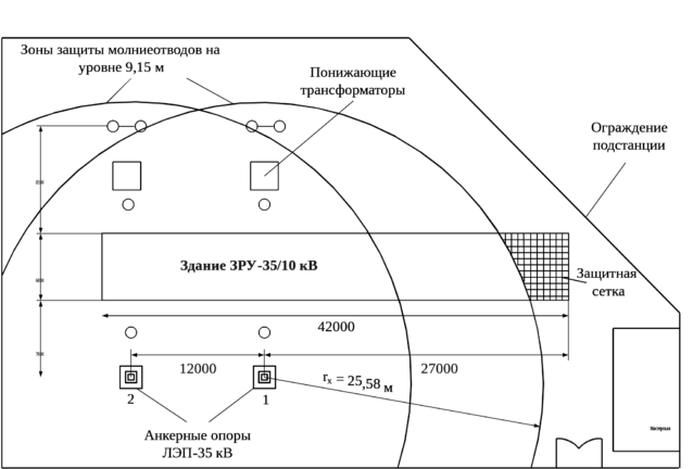 Поскольку на подстанции вне здания подстанции находятся оба понизительных трансформатора и их выводы, то необходимо защитить их от прямых ударов молнии. Однако, как говорилось выше, установка молниеотводов вблизи трансформаторов опасна. Рассмотрим вариант молниезащиты подстанции при помощи концевых опор ЛЭП-35 кВ.