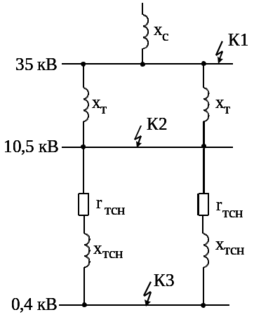 Рисунок В.2 - Расчетная схема с указанием точек короткого замыкания