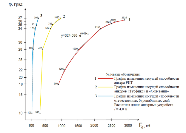 Анкеры РИТ, в зависимости от глубины погружения и характеристик грунтов, характеризуются несущей способностью от 500 до 20000 кН. Они могут быть использованы при расчистке завалов, для закрепления мостов, мачт, опор кабель-кранов, для удержания летательных аппаратов и в других случаях. На графиках (рис. 4) показано сравнение несущей способности анкеров РИТ с аналогичными отечественными и зарубежными конструкциями.
