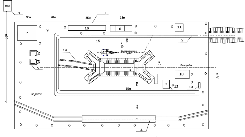 1.отсыпка строительной площадки; 2. устройство подъездного пути; 3. разработка котлована; 4. устройство временной металлической гофрированной трубы; 5. транспортный средства; 6. складирование инертных заполнителей(песок); 7. механизированная площадка; 8. горюче-смазочные материалы; 9. освещение территории строительной площадки; 10. бытовые помещения; 11. администраторская(прорабная); 12. энергоустановка; 13. пожарный щит; 14. устройство схода в котлован; 15. монтажный кран; 16. площадка складирования элементов трубы.