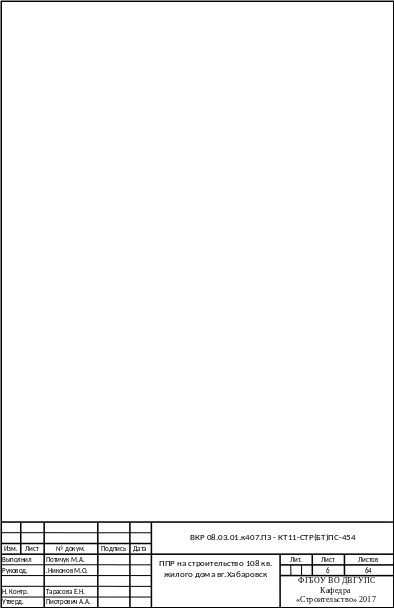 Выпускная квалификационная работа (ВКР) выполнена по заявке ООО «Империал». Проектная документация 108 кв. жилого дома в г.Хабаровске выполнена строительной компанией ООО «Империал», а автору поручено разработать проект производства работ (ППР) на строительство. Данный проект необходим для организации работ технологической последовательности в соответствии со строительными нормами и с учетом обоснованного совмещения отдельных видов работ.