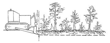 Расчистку строительной площадки производят бульдозером. Для удаления мелколесья и кустарника отвал бульдозера следует заглубить в растительный слой на 15 - 20 см. Затем перемещением бульдозера на малой скорости срезать растительность и удалить ее за пределы трассы. Расчистка бульдозером трассы представлена на рисунке В.2.