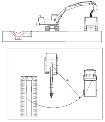 отвод поверхностных вод осуществляется трапециевидными продольными кюветами с заложением откосов 1:1,5. Отвод поверхностных вод осуществляется к ближайшему водопропускному сооружению. Разработка грунта в кюветах предусмотрена экскаватором XCMG XCG210LC-8 с объемом ковша 0, 9 м3. Грунт от разработки кювета пригодный для использования транспортируется на расстояние 1 км в насыпь, лишний грунт вывозится в отвал на расстояние 10 км в места, отведенные местной администрацией. Схема разработки кювета представлена на рисунке В.16.