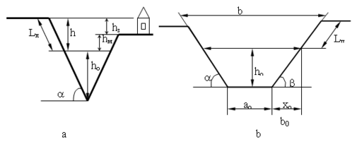 Рис. 1. Схема русла реки: а – треугольное русло: б – трапецеидальное русло.