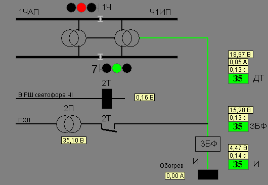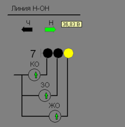 Над светофором стрелками Ч и Н отображается установленное направление движения. Рядом со стрелкой Н находится окно измерения напряжения в линейных проводах цепи Н-ОН.