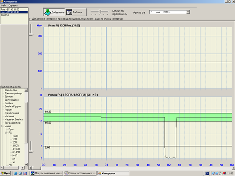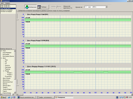 Объект измерения - рельсовая цепь (РЦ) – это путь, стрелочный и бесстрелочный участок пути на станции, ограниченный изолированными стыками, участок на перегоне, ограниченный изолированными стыками или без них. В АРМ-ШЧД по состоянию РЦ контролируется нахождение подвижных единиц на станции и перегоне, а также состояние установленных маршрутов на станции. При контроле состояния и параметров РЦ диспетчер СЦБ выводит на экран значения напряжения на путевом реле и сопротивления изоляции кабеля, а также временной график напряжений. Программа предоставляет возможность просматривать графики изменения напряжения и сопротивления на конкретной рельсовой цепи за указанный диспетчером период времени.