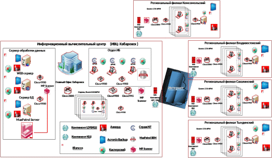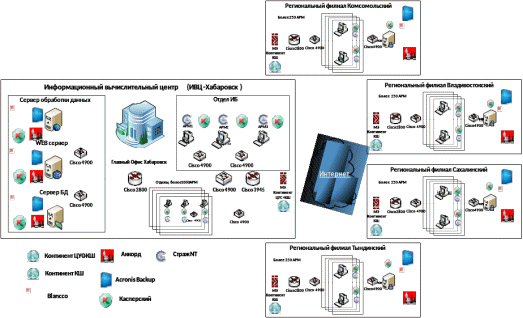 Структура информационной системы ИВЦ ОАО «ДВЖД» представлена в приложении А. Где показано взаимодействие ИВЦ Хабаровск с региональными филиалами ОАО «ДВЖД». ИВЦ Хабаровск подчиняется ГВЦ ОАО «РЖД» который расположен в городе Москва. Число автоматизированных рабочих мест в ИВЦ Хабаровск составляет более 1000, здесь имеется отдел информационной безопасности и технического обслуживания, который обслуживает данную ИС предприятия. Так же установлено более восьми серверных зон, где обрабатывается вся информация транспортного предприятия ОАО «ДВЖД». В каждом регионе имеется сервера, которые обмениваются информацией с ИВЦ Хабаровск. Примерное число автоматизированных рабочих мест в каждом регионе составляет более 500.