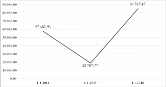 Наибольшую долю занимают вклады до 200 тысяч рублей: в 2014 году их доля составляла 38,14%, на 2015 года составляет 27,89%. Вклады размером от 200 до 400 тысяч рублей составляют около 19% на начало анализируемого периода, а на 1 января 2016 года их доля составляет уже 15,3%. Вклады размером от 400 до 700 тысяч рублей в 2014 г. занимают около 16%, а в 2016 г. их доля сократилась до 14,9%. Все остальные вклады наибольшего размера возросли как в абсолютном выражении, так и в относительном.