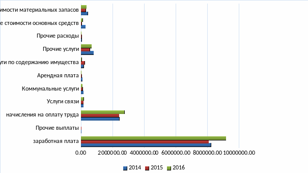 видно, что структуре расходов 2014 – 2016гг. наибольший удельный составляют расходы заработную плату, среднем - 67,4%, начисления оплату труда, 20 %.