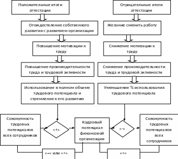 Как видно из представленной схемы положительные итоги аттестации напрямую способствуют к повышению мотивации и далее к увеличению производительности труда и трудовой активности. В таком случае человек стремится полностью использовать имеющийся у него трудовой потенциал и предпринимает шаги к его наращиванию. В случае отрицательных итогов аттестации степень использования личного трудового потенциала работника резко снижается, а механизм влияния аттестации персонала на кадровый потенциал финансовой организации имеет отрицательное значение.