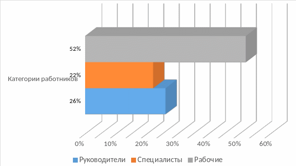 В опросе приняло участие 50 сотрудников (результаты опроса представлены в приложении 4)Уссурийской дистанции гражданских сооружений, из них 11 человек занимают руководящие должности (начальник дистанции, заместители начальника, начальники участков, главные инженеры, главные механики, главные энергетики); 13 человек специалистов (инженеры, технологи, энергетики, механики, конструкторы); 26 человек рабочих (операторы, сварщики, резчики, станочники, токари, фрезеровщики, фасовщики, уборщики, подсобные рабочие). На рисунке 9 показаны категории работников организации по всему численному составу предприятия в процентном выражении.