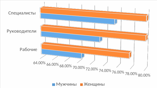 В ходе проведения анкеты было выявлено, что женщины независимо от того к какой категории работников они относятся, более удовлетворены своим трудом (среднее значение 79,2%), чем мужчины (среднее значение 73,1%) (см. рисунок 10).