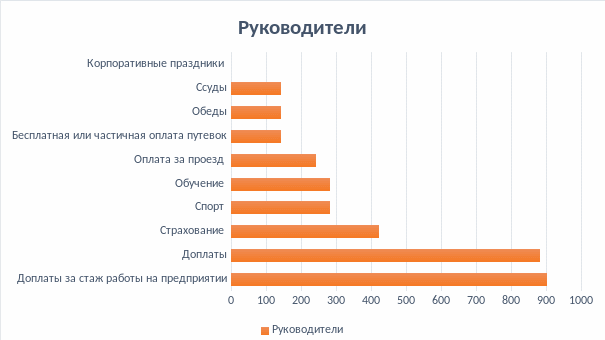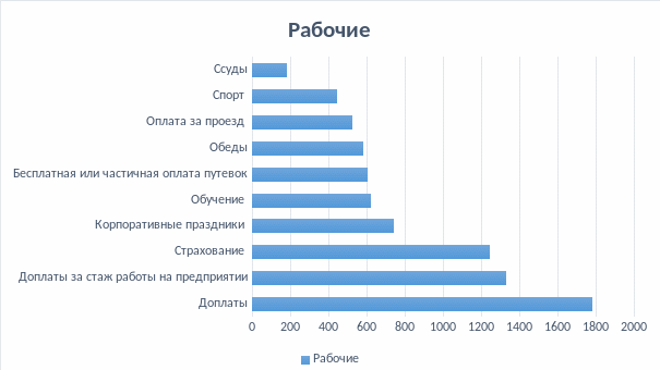 Работникам была предложена таблица, в которой необходимо было указать 5 самых важных характеристик работы. Данные о результатах опроса представлены на рисунке 11 для рабочей категории работников, на рисунке 12 для руководителей, и на рисунке 13 для специалистов.
