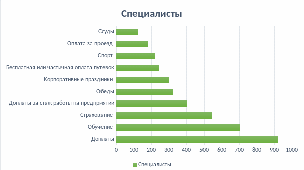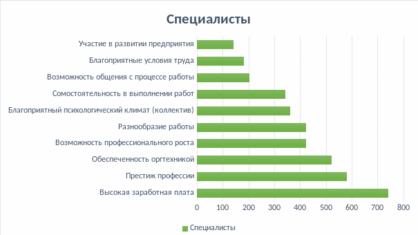 Специалисты относятся к работе немного иначе, чем рабочие или руководители, у них на первом месте находятся доплаты в виде бонусов и премий, а вот дальше имеют значение моральные методы стимулирования, а доплаты за стаж работы для специалистов стоит лишь на четвертом месте.