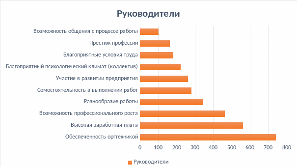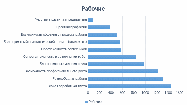 Выяснилось, что 22% работников не довольны своими условиями труда. Этому пункту стоит уделить особое внимание. Руководство предприятия должно обеспечить своих сотрудников безопасными условиями труда. Оснащенность рабочих мест работников, занятых в производстве более современной оргтехникой, удобными креслами, поддержанием необходимой температуры воздуха, это необходимые меры. Как показала анкета обеспечение оргтехникой является самой важной характеристикой, которой должна обладать предоставленная работа у руководителя, для специалиста она менее важна (на 3 месте), для рабочего почти не важна (на 6 месте).