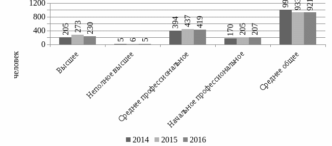 На рисунке 2.10 графически изображена динамика численности персонала по уровню образования АО «Алданзолото» ГРК» за 2014-2016 год.