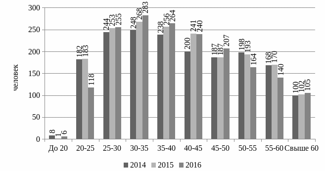 На рисунке 2.11 графически изображена средняя динамика численности персонала по возрастным группам АО «Алданзолото» ГРК» за 2014-2016 год.