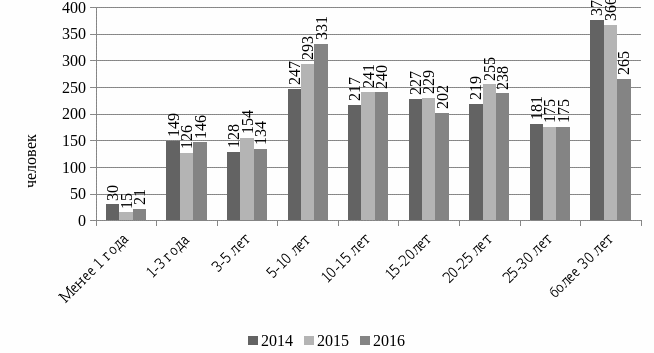 На Рисунке 2.9 графически изображена динамика численности персонала по стажу 2014-2016 гг.