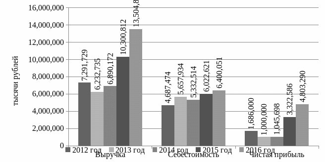 Чистая прибыль в 2013 году составила 1 000 000 тыс. руб. и по сравнению с 2012 годом снизилась на 40,68%, что обусловлено ростом затрат на выполнение вскрышных работ по добыче руды (перспективные эксплуатационные горно-капитальные работы), а увеличение данного показателя в 2014 году относительно 2013 года составило 4,57%, в 2015 году относительно 2014 года на 217,74%, в 2016 году на 44,56%, и составила 4 803 290 тыс. руб.