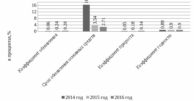 Одновременно с указанными коэффициентами положительную тенденцию имеет коэффициент прироста. В 2015 году его рост составил 0,13, а в 2016 году из-за повышения значения коэффициента обновления над коэффициентом выбытия, его рост составил 0,155. В 2015 году произошла замена оборудования, одновременно с увеличением коэффициента обновления на 0,18 (с 0,058 до 0,238), коэффициент выбытия увеличился на 0,091 (с 0,007 до 0,098). В 2016 году такого масштабного обновления не было. Поэтому значение коэффициента обновления увеличилось только на 0,038, а коэффициент выбытия снизился на 0,068.