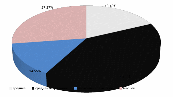 | -высшее | 14 | 31,11 | 15 | 27,27 | 15 | 25,42 | 1 | -5,69 | 7,14 |