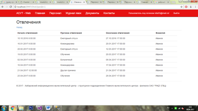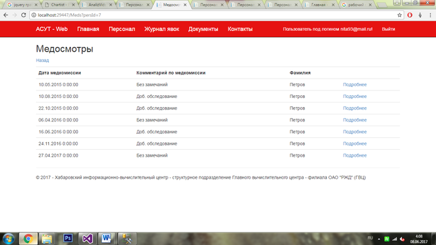 Система позволяет просмотреть более подробную информацию по медкомиссиям сотрудника, инструктажам, ОТ и ТБ и отвлечениям. Эти данные пользователь может просмотреть, нажав на ссылку в соответствующем поле таблицы выбранного сотрудника.