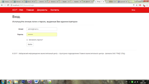 Для добавления и редактирования информации на сайте пользователь должен обладать определенными правами, которые определяются его ролью. Полным набором прав обладает пользователь с ролью admin. Чтобы подтвердить роль администратора нужно войти в систему под его учетной записью. Для перехода на страницу регистрации после входа на сайт в адресной строке браузера необходимо дописать /Account/Login либо выбрать вкладу «Войти», расположенную в правой части ленты.