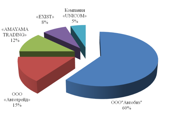 На рисунке 4 мы видим, что большую часть поставок магазину совершает «Автобиз», это 60% всего ассортимента магазина, а именно: автозапчасти, расходные жидкости, масло и смазки, автолитература, и различные принадлежности. Остальные 40% разделили между собой такие компании, как: «Автотрейд» (15%), «AMAYAMATRADING» (12%), «EXIST» (8%) и компания «UNICOM» (5%).