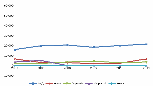 Как видно из рисунка 3, большим спросом в перевозке грузов пользуется железнодорожный и автомобильный транспорт. Это обусловлено тем, что автомобильный транспорт отличается высокой мобильностью и универсальностью, а так же возможностью доставки грузов «от двери до двери», в то время как, железнодорожный транспорт позволяет перевозить огромные количества самых разнообразных по типу, весу и форме товаров на большие расстояния. Железнодорожный транспорт выгоден со стороны надежности и относительной дешевизны, кроме того он позволяет перемещать большие объемы тяжелых грузов.