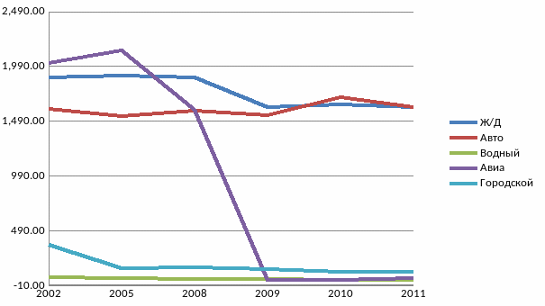 Рассмотрим пассажирооборот по видам транспорта общего пользования на рисунке 9.