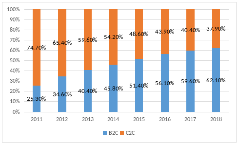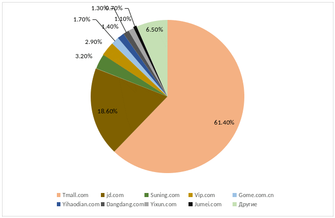 Так, согласно данным CNNIC (China Internet Network Information Center), в 2015 г. на долю компаний, занимающихся розничной электронной коммерцией в форматах B2C и C2C пришлось 18,5% от общего числа участников рынка электронной торговли.