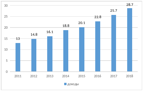 Рисунок 8 - Динамика развития рынка мобильной коммерции в период 2011-2018 гг (2016-2018 гг. прогнозируемые)