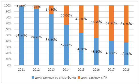 Рисунок 7 - Динамика интернет-покупок, совершенных при помощью ПК и мобильных устройств (2016-2018 гг. прогнозируемые)