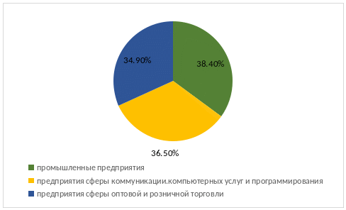 На первом месте в структуре данного сектора находятся промышленные предприятия, на долю которых, согласно данным CNNIC. в 2015 г. приходилось 38,4%, на втором месте - предприятия сферы коммуникации, компьютерных услуг и программирования. Их доля в структуре электронных торговых операций составляет - 36,5%. Третье место занимают предприятия сферы оптовой и розничной торговли -34,9% .