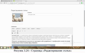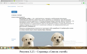 Следующая кнопка в панели управления у Администратора является «Статьи» (рисунок 3.25).Данная форма также создана для возможности заполнения данных по статьям Администратором. Для создания новой статьи необходимо нажать кнопку «Создать», для корректировки статьи – на ее название. После этого можно заполнять данные (рисунок 3.26).