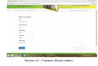 На ней он может принять заявку, т.е. записать на прием клиента. Для этого ему необходимо нажать на элемент таблицы «Принять заявку». После этого открывается страница с формой, в которой доктор может изменить время и дату приема или записать на то время, которое было указано клиентом (рисунок 3.16).